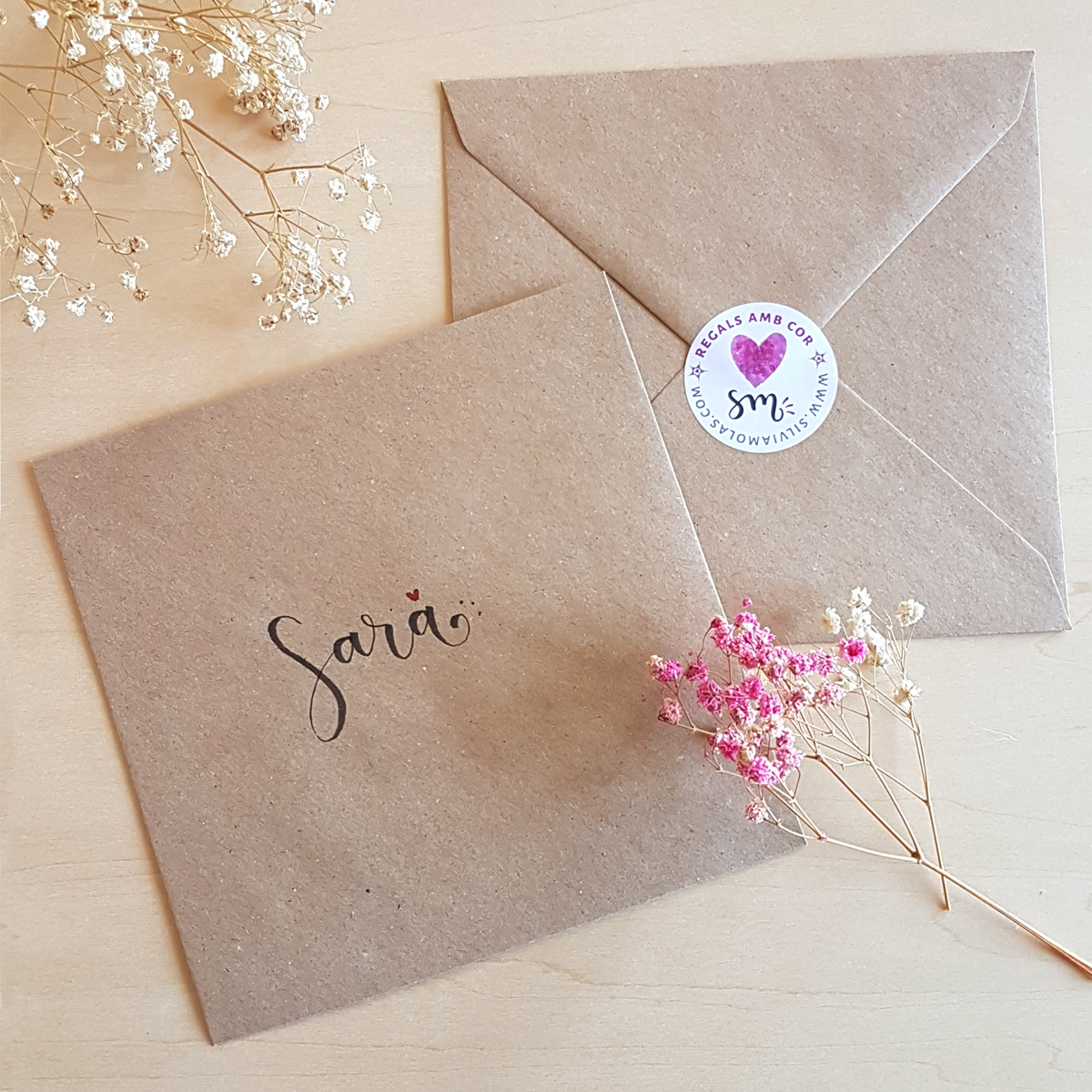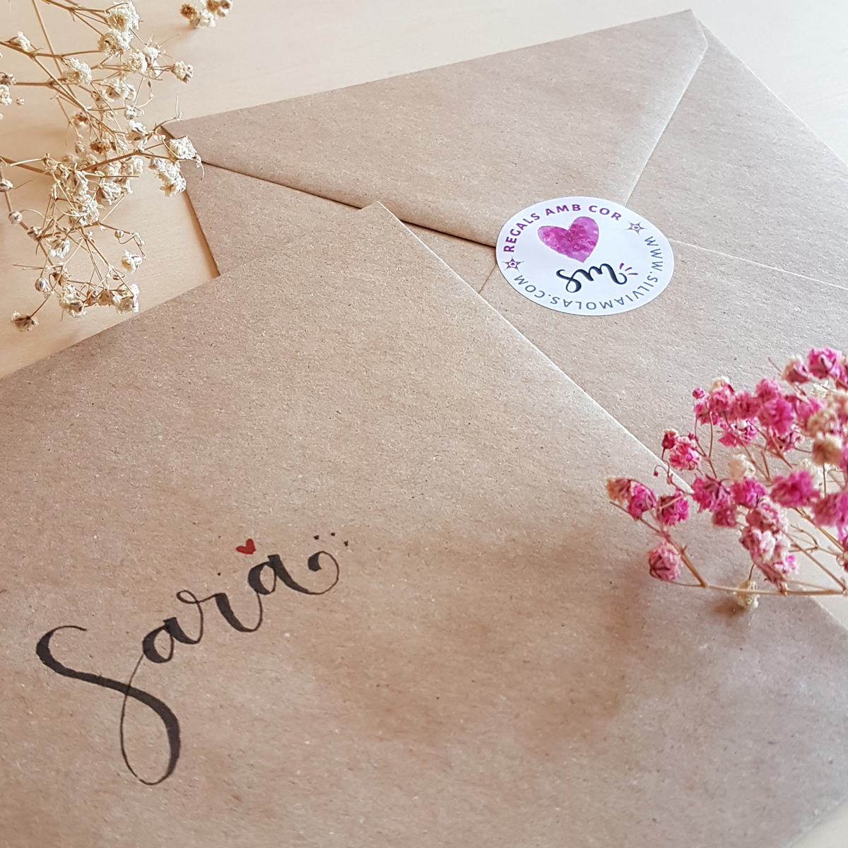 Opcional sobre de paper kraft personalitzat amb el nom, amb etiqueta adhesiva de “Regals amb cor”.