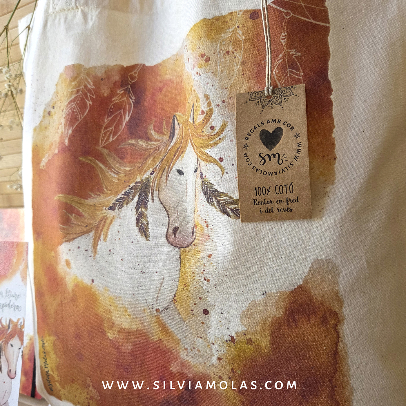 - Bossa de cotó 100% (tote bag), en color natural de 140 gr amb la il·lustració “Cavall”.