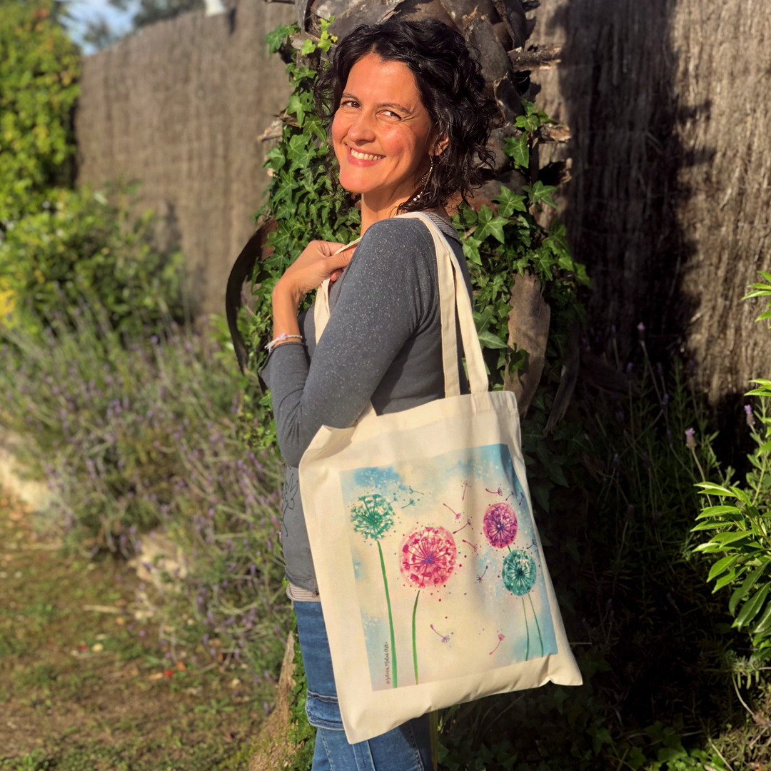 Bolsa de algodón 100% (tote bag) en color natural con la ilustración “Diente de león”.